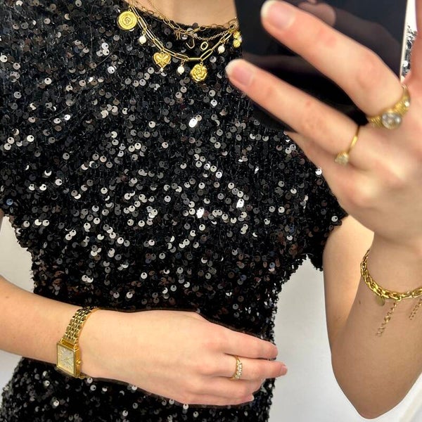 All- over pailleten jurk met schoudervulling. De jurk heeft een ritssluiting aan de achterkant en heeft een aangeloten pasvorm