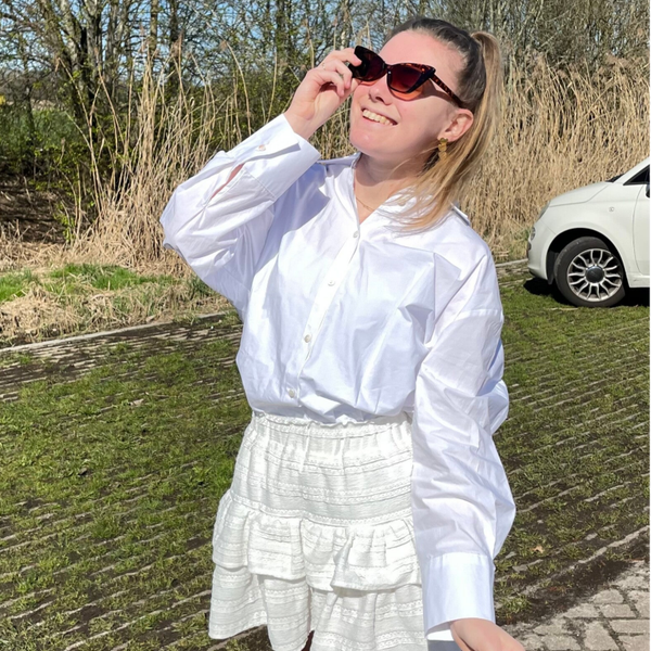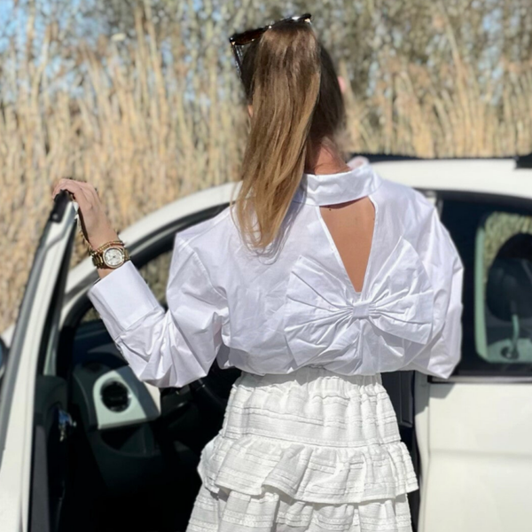 Deze witte blouse lijkt simpel van voren, maar verrast met een strik op de rug. Perfect voor een classy look met een speelse twist!
