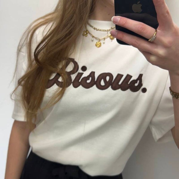 Voeg een vleugje Franse charme toe aan je gaderobe met ons 'bisous' T-shirt! Deze is gemaakt van zacht, ademend katoen met stijlvolle bruine letters.