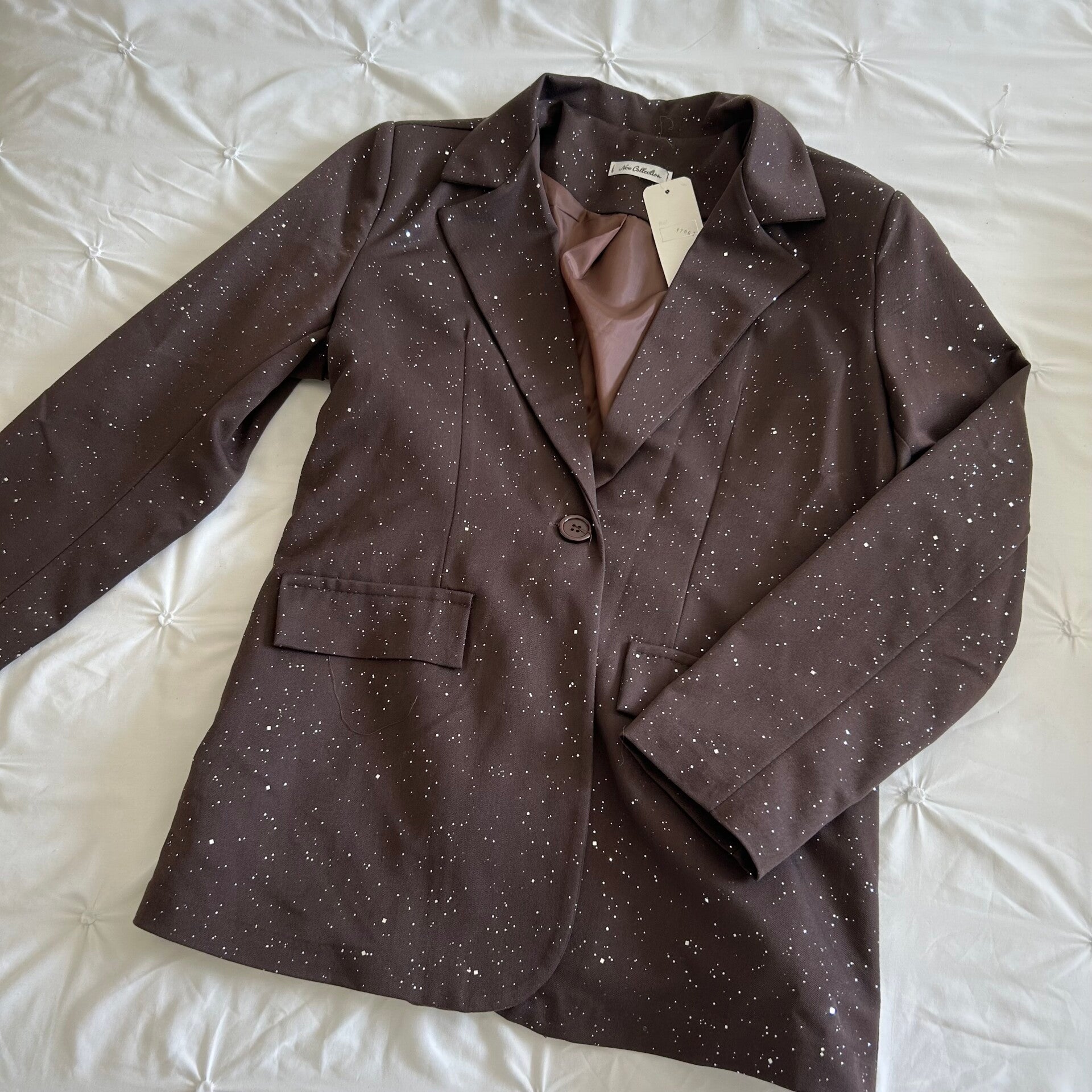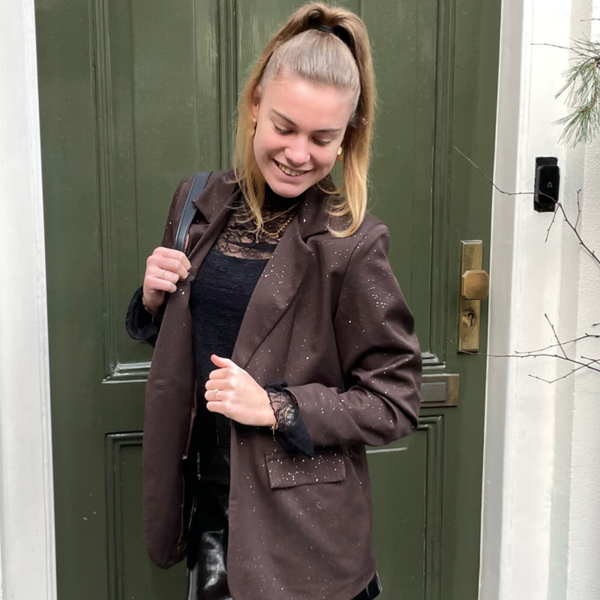 Deze bruine blazer met subtiele glinsterende zilveren stipjes geeft elke outfit een stijlvolle, feestelijke uitstraling. Een tijdloze must-have die je ook na de kerst met plezier blijft dragen.