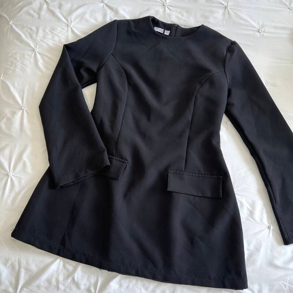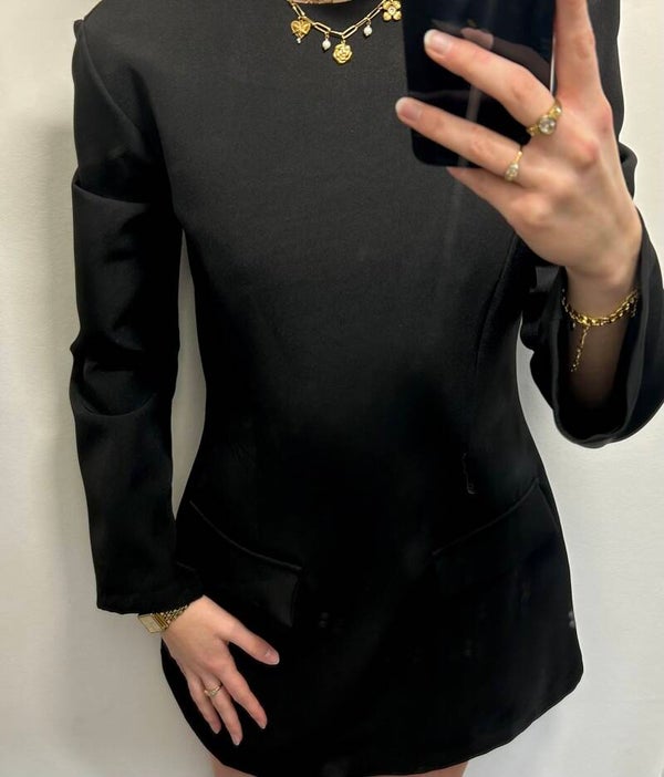 Aan de voorzijde van deze zwarte jurk vind je twee verfijnde klepzakjes als stijlvol detail, subtiel, chic en helemaal in lijn met de moderne look. De jurk sluit mooi aan op het bovenlichaam en loopt vanaf de rok iets wijder uit. Ook de mouwen volgen dit spel van strak naar licht uitlopend, wat de jurk een extra chique uitstraling geeft.